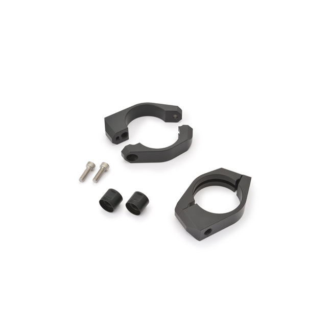 - For 43mm diameter fork tubes - Includes two CNC machined aluminum 2-piece clamps; with required hardware - Black painted finish - Compatible with all 8mm threaded turn signals - Probably the easiest way to install turn signals to your motorcycle - Allows installation around the fork tube without removing or disassembling other components - The slim design makes them hardly noticeable - A groove is machined inside of the clamp so wiring can be hidden