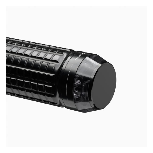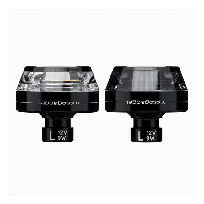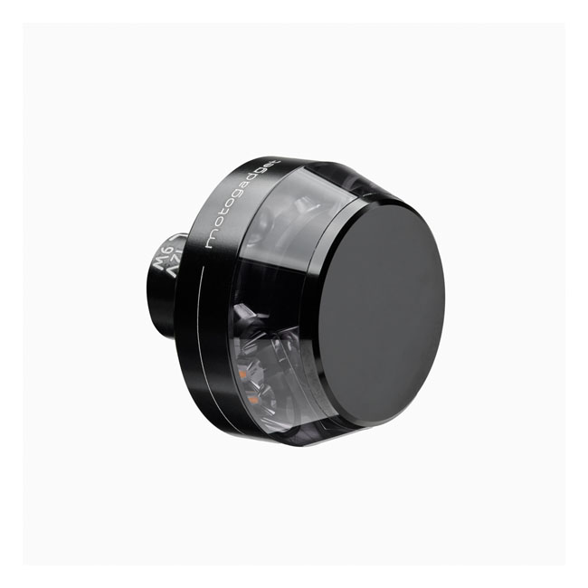 Black anodized finish. Dark lens. Universal handlebar installed turn signals with Power LED performance. Special 360° lighting effect through the dark transparent glass-like material in combination with a power LED. Essentially a transparent light disc on a aluminum base and ECE approved for front use. Diameter 35mm; OAL 68mm; Inside bar 48mm; outside bar 20mm; wiring length 100cm. Fits all 22mm and 1" handlebars with an Inside diameter of 14mm to 21mm. With 7W power LEDs.