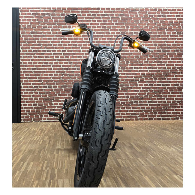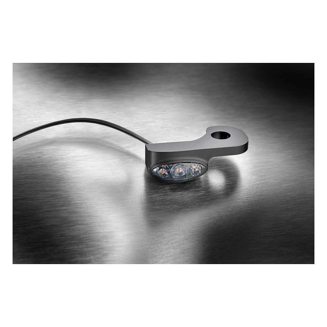 2.5W; 3 LEDs. An inconspicuous install below the handlebar and approved for front use. Hard to spot once installed but street legal. In busy traffic it is important that turn signals are actually seen; this is where the Kellermann power LEDs shine... they are spectacularly bright so you will not be overlooked. Apart from the power LEDs a sophisticated system of lenses and reflectors; called EXtranz® (Extreme Optical Transparency technology); is used. Installation is bolt-on and all electronics of the Dash turn signals are inside the turn signal housing; for easy connecting to the 12 volt system. - Sensationally small; spectacularly bright - EXtranz® - Extreme Optical Transparency Technology - Kellermann HighPower LED Technology - Longlife Protection Guard®; IC operated; 330 kHz - Black quality metal housing with tinted lens - Suitable for 12 volt DC applications - European design protection - Approved for front use. Note: Electronic equipment may be required to regulate flash rate (see 996466 Kellermann i.Nex equalizer for an easy turn signal; tail/brake lights and position lights installation solution)