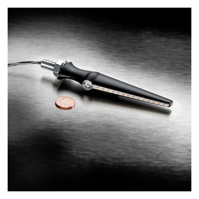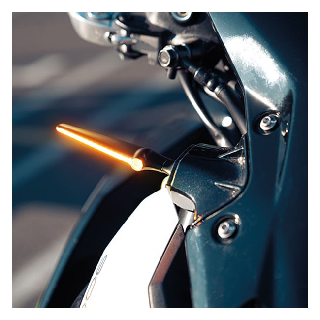 Dual function. Turn signal with position light / running light function with a clear lens. ECE approved for front use. With sequential lighting turn signals (one lighting after the other; in a 'wave-like' pulsating motion). The lens is clear and the unit is equipped with 16 extremely bright high-power LED technology. The one of a kind slim and sleek design is inspired on a wing with an integrated jet-engine. - Highest light output - Kellermann HighPower LED Technology - state-of-the-art "IC" chip technology - 32 MHz real-time microprocessor control - Silent current; advanced power saving algorithm - High level of visibility over a wide range of angles - Longlife Protection Guard® - Suitable for 12 volt DC electrical system - Flow-optimized metal housing; highest quality workmanship - M8 x 20mm threaded - Dimensions: 20mm high x 118mm wide (without threads) - High quality rubber bushing; vibration absorbing installation - Globally protected design. Note: See 948459 for the style matching Jetstream 3-1 taillight; brake & turn signal unit; for rear use.