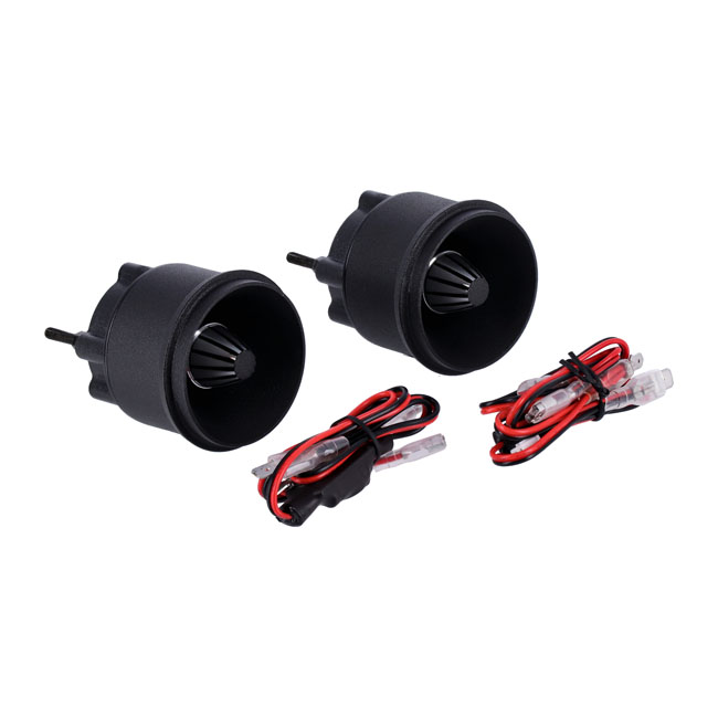 These tweeters can be mounted in the OEM batwing fairing gauge hole and are plug-n-play with the OE wire harness.Highlights:Titanium ring radiator tweeter increases efficiency & high-frequency transientsDiecast aluminum chassis molded for installation in original fairing gauge holeAccommodates OEM & aftermarket gauge trim rings Low mass neodymium rare earth element magnets for maximum outputIntegrated horn & phase plug improve high-frequency dispersion patternsPlug-n-Play t-harness included for quick integration to OEM speaker wireIntegrated 12dB 4kHz high-pass crossover & overload protection circuit breaker50w RMS;100w MAX; 105dB SPL; 4kHz-22kHz Frequency responseNote: replacement tweeter diaphragm available as 999375