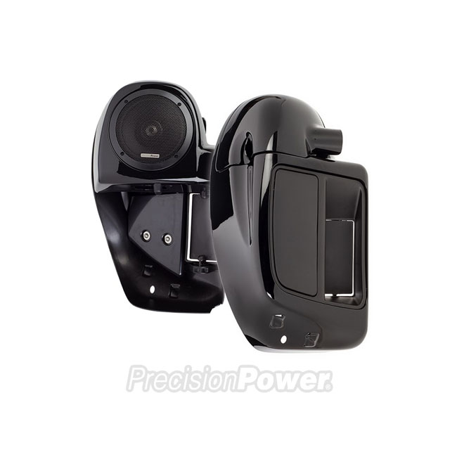 Precision Power’s direct fitment solution for lower-fairing speakers works excellent on your Touring bikes! Add speaker pods for that additional audio punch; make your motorcycle a concert hall! Housing construction uses high-grade industrial ABS plastic; sure to last the rough impairments on the highway. Each kit is painted only in Vivid Black. Sold with speakers for left and right lowers and includes waterproof quick disconnect plugs for installer-friendly design. Pre-wired for MAA.400 Audio Amplifier (MCS 999394).Highlights:Vented lower fairing in gloss black made of industrial grade ABSMidrange notch filter included for OE pod installationWaterproof quick-disconnect plugs for easy install & removalPre-wired with MAS.654 Premium 6.5" speakersPlug-N-Play wire harness connects to MAA4.400 Amplifier (MCS 999394)Wire harness can accommodate installation to alternate amplifier