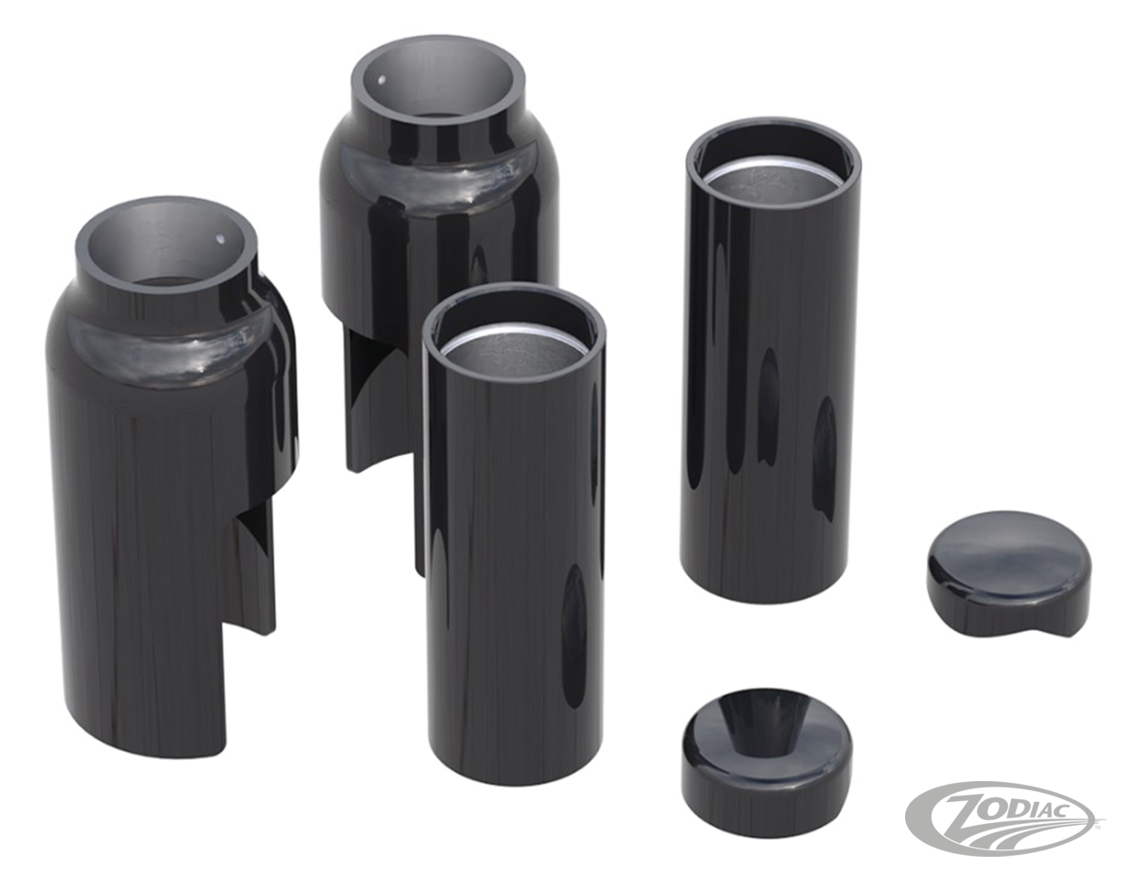 Easy to install covers that give your front fork beefier looks. Parts are CNC machined aluminum with a black powder coated finish and come complete with hardware where necessary. ● Two-piece kits include a pair of covers that go over the fork tubes between the upper and lower triple trees (A) ● Four-piece kits also include a pair of covers for the upper fork tube nuts (B) ● Six-piece kits also include a pair of covers that go below the lower triple tree and cover up the fork tubes (C)
