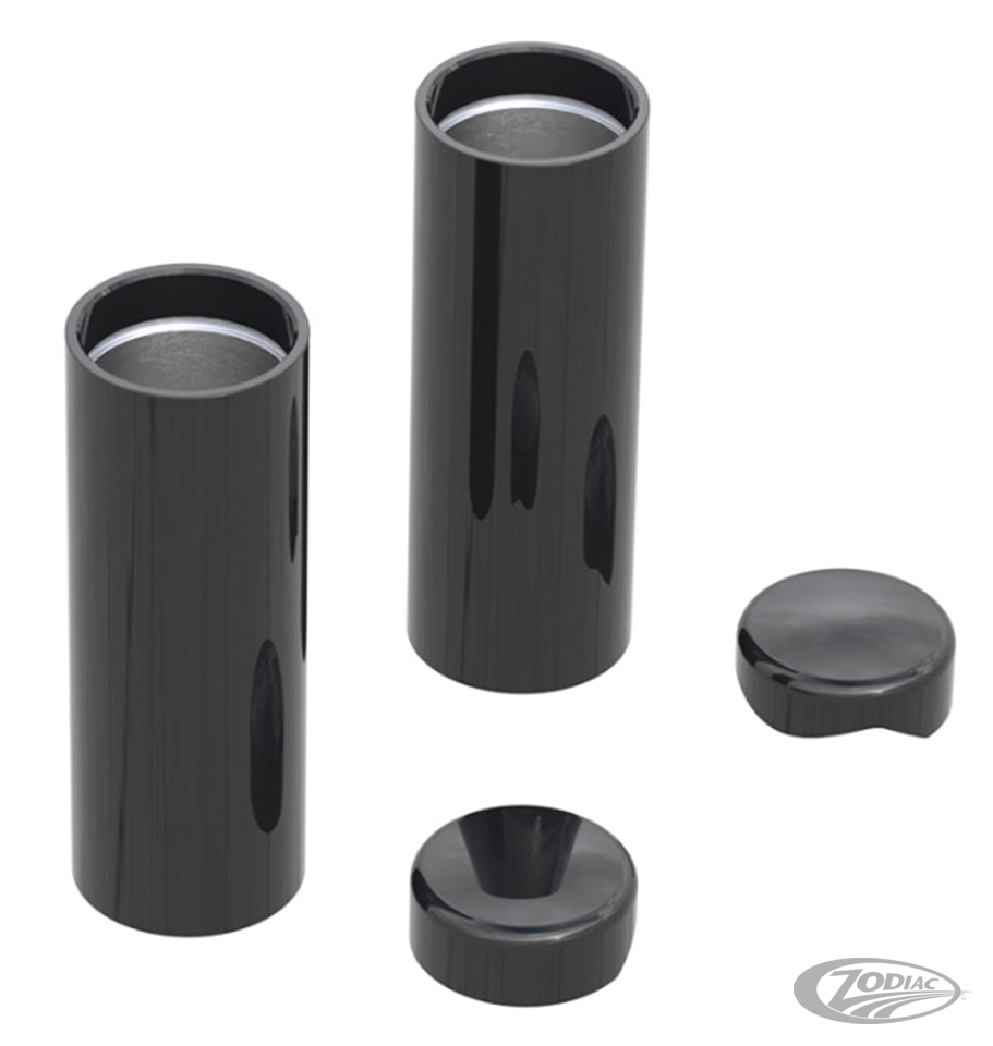 Easy to install covers that give your front fork beefier looks. Parts are CNC machined aluminum with a black powder coated finish and come complete with hardware where necessary. ● Two-piece kits include a pair of covers that go over the fork tubes between the upper and lower triple trees (A) ● Four-piece kits also include a pair of covers for the upper fork tube nuts (B) ● Six-piece kits also include a pair of covers that go below the lower triple tree and cover up the fork tubes (C)