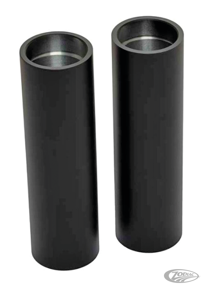 Easy to install covers that give your front fork beefier looks. Parts are CNC machined aluminum with a black powder coated finish and come complete with hardware where necessary. ● Two-piece kits include a pair of covers that go over the fork tubes between the upper and lower triple trees (A) ● Four-piece kits also include a pair of covers for the upper fork tube nuts (B) ● Six-piece kits also include a pair of covers that go below the lower triple tree and cover up the fork tubes (C)