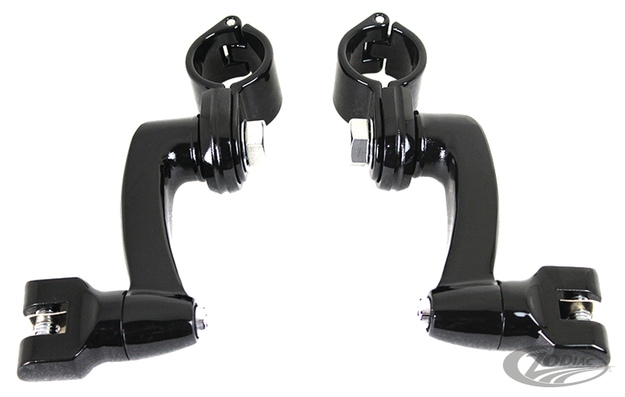 These 360 degree adjustable highway peg mounts for use on 1 1/4" (32mm) tubes can be locked in almost any position to suit both tall and short riders. Works with all standard male mount footpegs. Sold in pairs.
