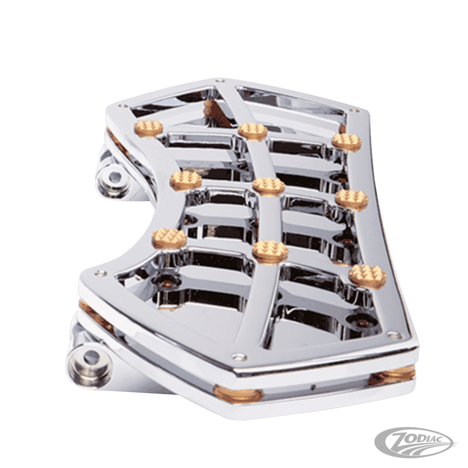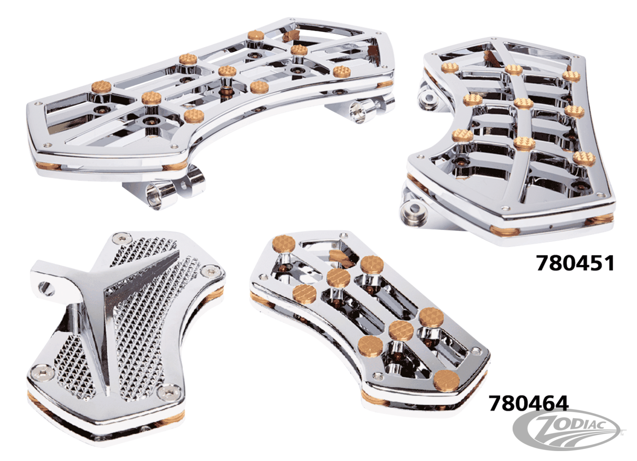 Driver boards, fit 2012-2016 FLD Switchback, 1986-2017 FL Softail, 1980 to present Touring (except FLHTCUL & FLHTKL) and 2009 to present Trike, Polished with brass Diamond gems