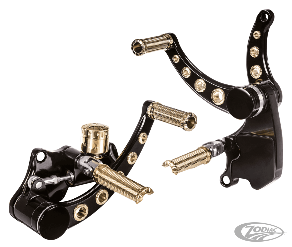 Billet aluminum forward control kit with foldable footrests, a 11/16" bore rear brake master cylinder and gems in the brake and shifter arms. Installation on FL Softail require the separate purchase of a FXST style shifter rod.