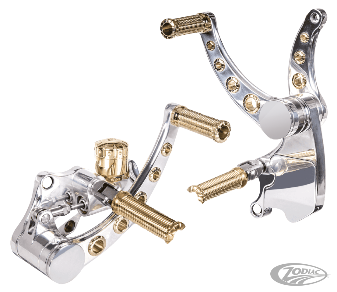 Billet aluminum forward control kit with foldable footrests, a 11/16" bore rear brake master cylinder and gems in the brake and shifter arms. Installation on FL Softail require the separate purchase of a FXST style shifter rod.