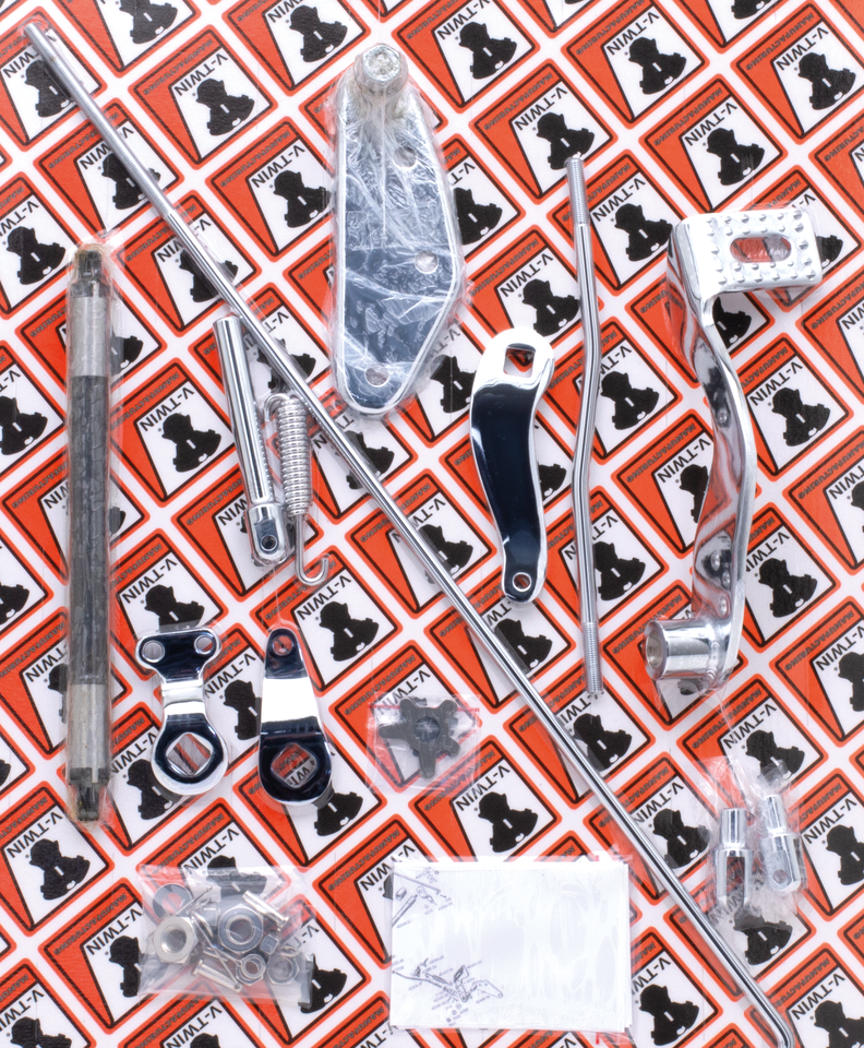 Kits with all parts to finish restoration or to fit forward controls on a custom hardtail frame made for use with a mechanical rear brake and a cross over shaft. Kits are made by V-Twin Mfg. and include all parts except the crossover shaft bushings. Most parts are also available individually.