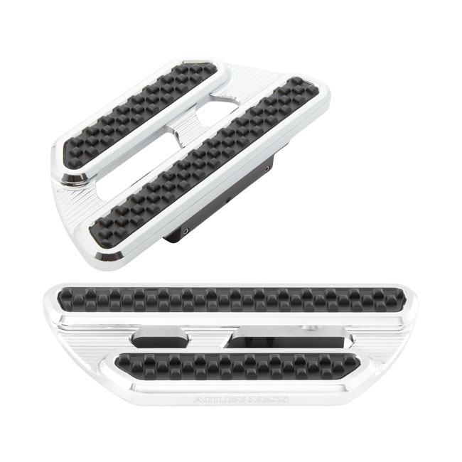 Chrome plated. CNC machined billet aluminum construction with 'Arlen Ness' lasered logo on the side. The internal structure of the rubber inlays is specifically engineered to help reduce vibration reduction produced by V-Twin engines. Dimensions: 8" long x 4.25" wide. For models with passenger floorboards. Note: Compatible with 936632 rider floorboard brackets.