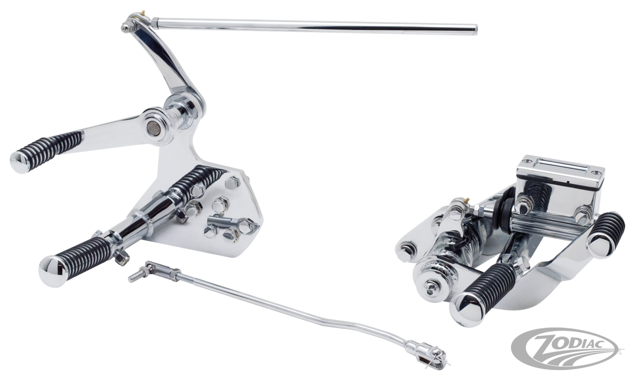 Komplette, verchromte vorverlegte Rastenanlagen inklusive 3/4" Hauptbremszylinder im Kelsey-Hayes-Style und allen Befestigungsteilen. Das Bremspedal und der Schalthebel laufen auf Bronzebuchsen, welche eine sanftere Pedalbewegung ermöglichen. Erhältlich sind ein komplettes Kit mit O-Ring-Style Schalt- & Fussrasten oder ein Bausatz komplett ohne diese Rasten.Die Bausätze ohne Rasten ermöglichen es Ihnen, die Rasten Ihrer Wahl auszuwählen oder sie passend zu Ihren Soziusrasten zu wählen. Die Fußrastenhalterungen besitzen weibliche Gabelköpfe, welche für die meisten Fußrasten des männlichen Typs geeignet sind. Die Schalt- & Bremshebel nehmen jede Art von Schaltraste auf. Eine Bremsleitung ist nicht im Lieferumfang enthalten. Hinweis: Bei einigen FXE 1980-1984 ist die rechte Befestigungslasche am Rahmen nicht installiert. Diese Modelle erfordern das Anschweißen unserer Befestigungslasche ZPN 233527.