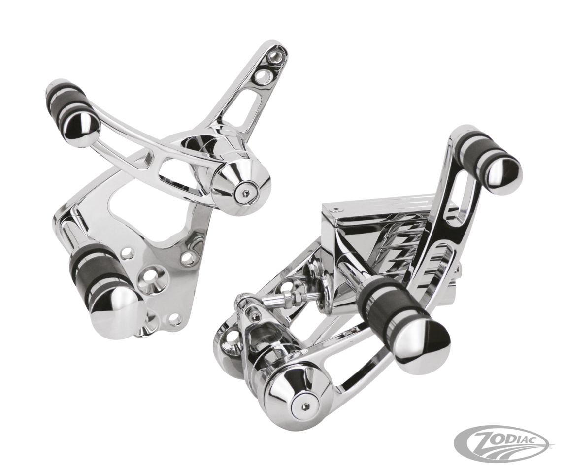 Diese sehr komplette und bezahlbare Rastenanlage wird aus hochwertigem Luftfahrtaluminium gerfertigt. Im Kit enthalten ist ein Billet-Alu Bremszylinder im Kelsey-Hayes Stil mit einer 3/4" Bohrung sowie "Rubber Band Style" Fuss und Schaltrasten. Das Bremspedal und der Schalthebel sind in Broncebuchsen gelagert was einen langen störungsfreien Betrieb garantiert. Diese Rastenanlagen sind ihr Geld wirklich wert und werden in Standardlängen sowie einer um 3" vorverlegten Version für Fahrer mit besonders langen Beinen angeboten. Kits sind erhältlich für alle Softail ab 1984 sowie für 4-Gang FX/FL 1958-1986. Die verchromten. Rastenanlagen besitzen ein Bremspedal mit Auflagefläche, die polierten Aluminium Rastenanlagen besitzen runde "Rubberband-Style" Rastengummis. Die Installation bei einer FXSTD Deuce erfordert die Verwendung des Spacer Kits ZPN 055011. Hinweis: Die 3" vorverlegte Fussrastenanlage passt nicht auf FLSTF (Fat Boy) und FLSTC (Heritage) mit den originalen Vorderradschutzblechen. Bei einigen FXE 1980-1984 kann die rechte Fussrastenaufnahme am Rahmen fehlen. Bei diesen Modellen muss zur Montage dieser Rastenanlage die Anschweisslasche ZPN 233527 angebracht werden. Hinweis: Schaltstangen (Std.Länge oder +3") sind in diesen Kits nicht enthalten. Für die +3" Version muss ZPN 110060 separat dazu bestellt werden.