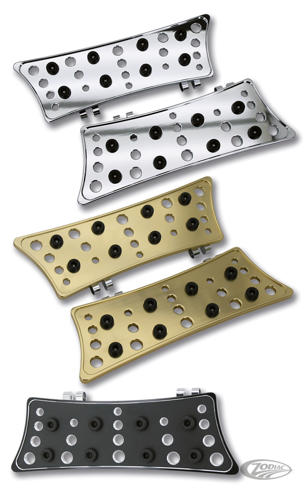 Diese Tritbretter aus Billet-Alu verleihen jedem Bike einen tollen Touch. Sie sind leicht zu montieren und zeichnen sich durch Halter im Custom-Design aus mit denen sie direkt an den serienmässigen Trittbrettaufnahmen montiert werden können. Die Energieabsorbierenden "Zi-Cone" Gummipads bieten guten Grip und guten Fahrkomfort unter allen Umständen. Passende Bremspedale, Schalt- &Beifahrerasten sowie Ersatzgummis sind ebenfalls erhältlich.