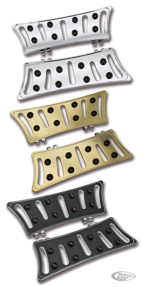 Diese Trittbretter aus Billet-Alu verleihen dem Bike eine richtige Custombike Optik. Sie sind besonders leicht zu montieren da sie spezielle Halter zur Befestigung an den originalen Trittbrettaufnahmen besitzen. Die energieabsorbierenden Zi-Cone Pads bieten exzellenten Fahrkomfort und sicheren Halt unter allen Umständen. Passende Bremspedale, Schaltrasten und Beifahrer Trittbretter sind ebenfalls erhältlich. Ersatzgummis sind im 16er Pack erhätlich.