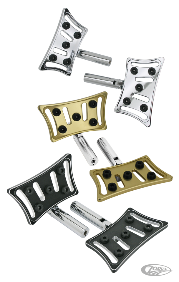 Diese Trittbretter aus Billet-Alu verleihen dem Bike eine richtige Custombike Optik. Sie sind besonders leicht zu montieren da sie spezielle Halter zur Befestigung an den originalen Trittbrettaufnahmen besitzen. Die energieabsorbierenden Zi-Cone Pads bieten exzellenten Fahrkomfort und sicheren Halt unter allen Umständen. Passende Bremspedale, Schaltrasten und Beifahrer Trittbretter sind ebenfalls erhältlich. Ersatzgummis sind im 16er Pack erhätlich.