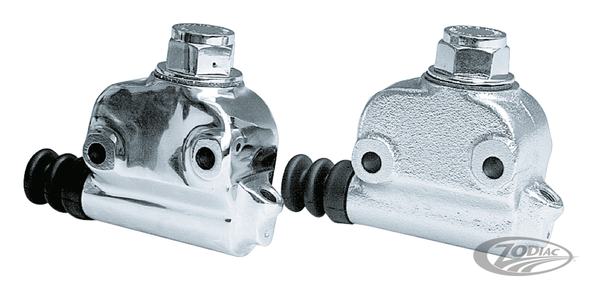 Kompletter Bremszylinder mit 3/4" Bohrung für FL Modelle von 1958-1972 und FX Modelle von 1971-1972 mit hydraulischer Trommelbremse sowie für FL/FX Modelle von Anfang 1973-1979 mit hinterer Scheibenbremse. Erhältlich mit verchromtem oder kugelgestrahltem Finish.