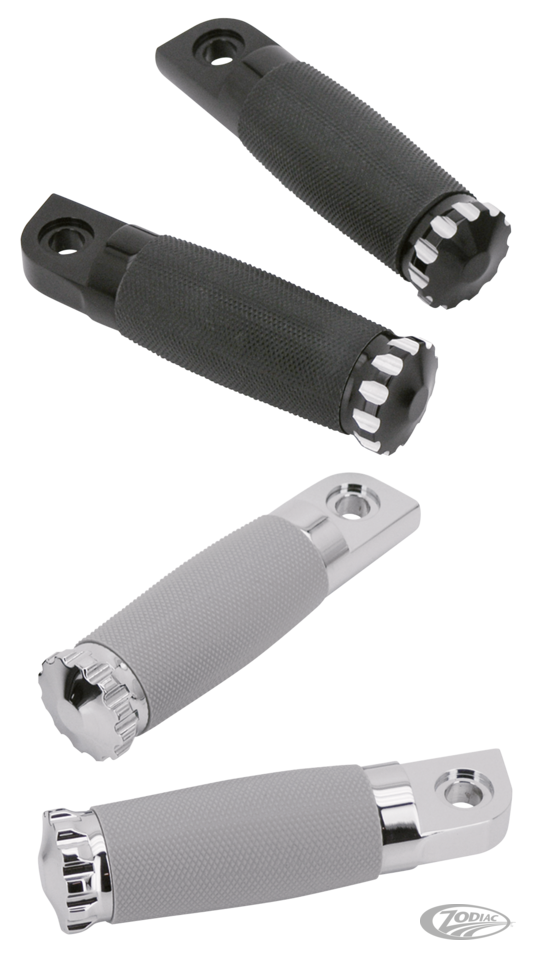Fahrer- & Beifahrerrasten im Turbo-Design werden aus Billet-Alu gefertigt und anschliessend verchromt, schwarz-eloxiert oder bronce-eloxiert. Sie besitzen ein Ummantelung aus Gummi für sicheren Halt und maximalen Komfort. Die Rasten sind 6" (15.3 cm) lang und 1 3/8" (3.5 cm) im Durchmesser. Sie eignen sich für die gängigsten Fahrer- & Beifahrerrastenaufnahmen. Passende Griffe finden sie in Kapitel 14.