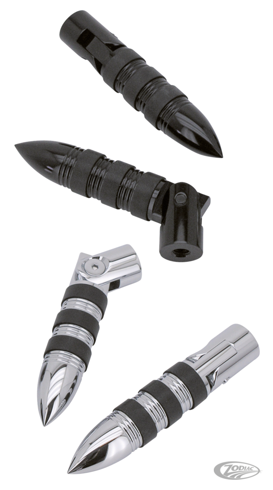 Magnum Rasten sind aus Billet Aluminium gefertigt und anschließend verchromt oder schwarz eloxiert. Sie verfügen über Gummibänder, die zusätzlichen Komfort und einen rutschfesten Halt für die Stiefel bieten. Fußrasten werden mit Halterungen geliefert und haben eine Gesamtlänge von 17,5 cm (6 7/8") und einen Durchmesser von 3 cm (1 3/16"). Die passenden Brems- und Schaltpins sind 10 cm lang und haben einen Durchmesser von 2,5 cm. Sie haben ein 5/16-18UNC-Gewinde und lassen sich leicht an die meisten Modelle und die meisten OEM- sowie Aftermarket Rastenanlagen anschrauben. Passende Magnum Lenkergriffsätze finden Sie in Kapitel 14. Alle Magnum Rasten werden in 2er-Sets angeboten.