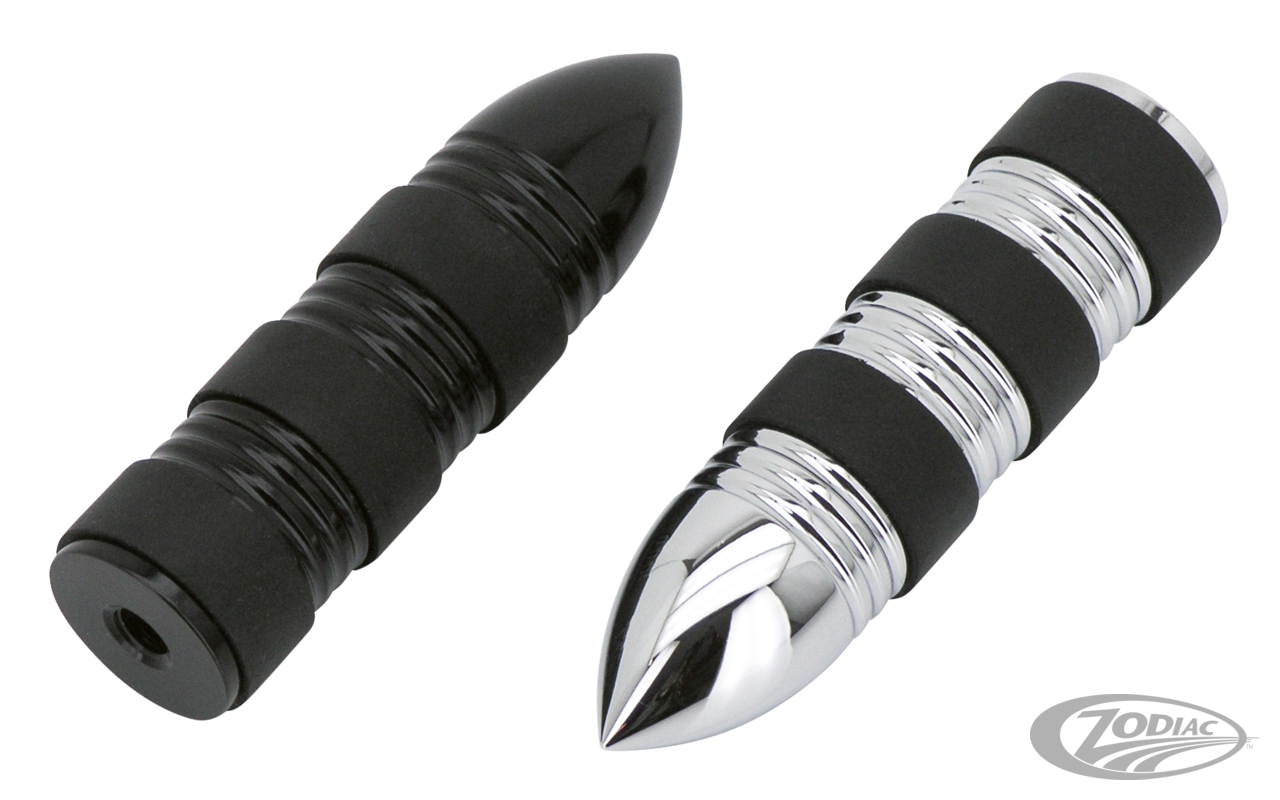 Magnum Rasten sind aus Billet Aluminium gefertigt und anschließend verchromt oder schwarz eloxiert. Sie verfügen über Gummibänder, die zusätzlichen Komfort und einen rutschfesten Halt für die Stiefel bieten. Fußrasten werden mit Halterungen geliefert und haben eine Gesamtlänge von 17,5 cm (6 7/8") und einen Durchmesser von 3 cm (1 3/16"). Die passenden Brems- und Schaltpins sind 10 cm lang und haben einen Durchmesser von 2,5 cm. Sie haben ein 5/16-18UNC-Gewinde und lassen sich leicht an die meisten Modelle und die meisten OEM- sowie Aftermarket Rastenanlagen anschrauben. Passende Magnum Lenkergriffsätze finden Sie in Kapitel 14. Alle Magnum Rasten werden in 2er-Sets angeboten.