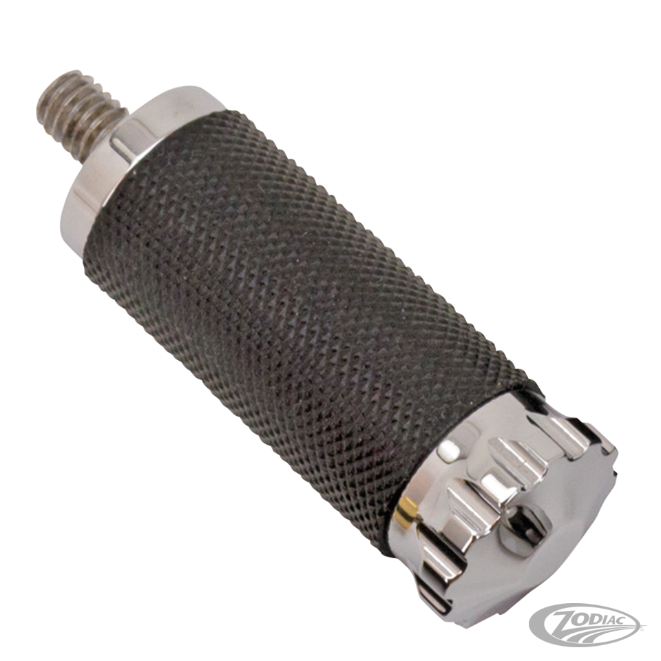 Die Turbo Brems- & Schaltrasten werden aus Billet-Alu gefertigt und anschliessend verchromt, schwarz-eloxiert oder bronce-eloxiert. Sie zeichnen sich durch stabile Gummis für sicheren Halt und extra Fahrkomfort aus. Sie werden einzeln angeboten und sind 2 1/2" (6.4 cm) lang sowie 1" (2.5 cm) im Durchmesser. Beide besitzen ein 5/16-18 UNC Gewinde und lassen sich einfach an den meisten Serienhebeln oder Zubehörrasten-Kits montieren. Passende Griffe finden sie in Kapitel 14.