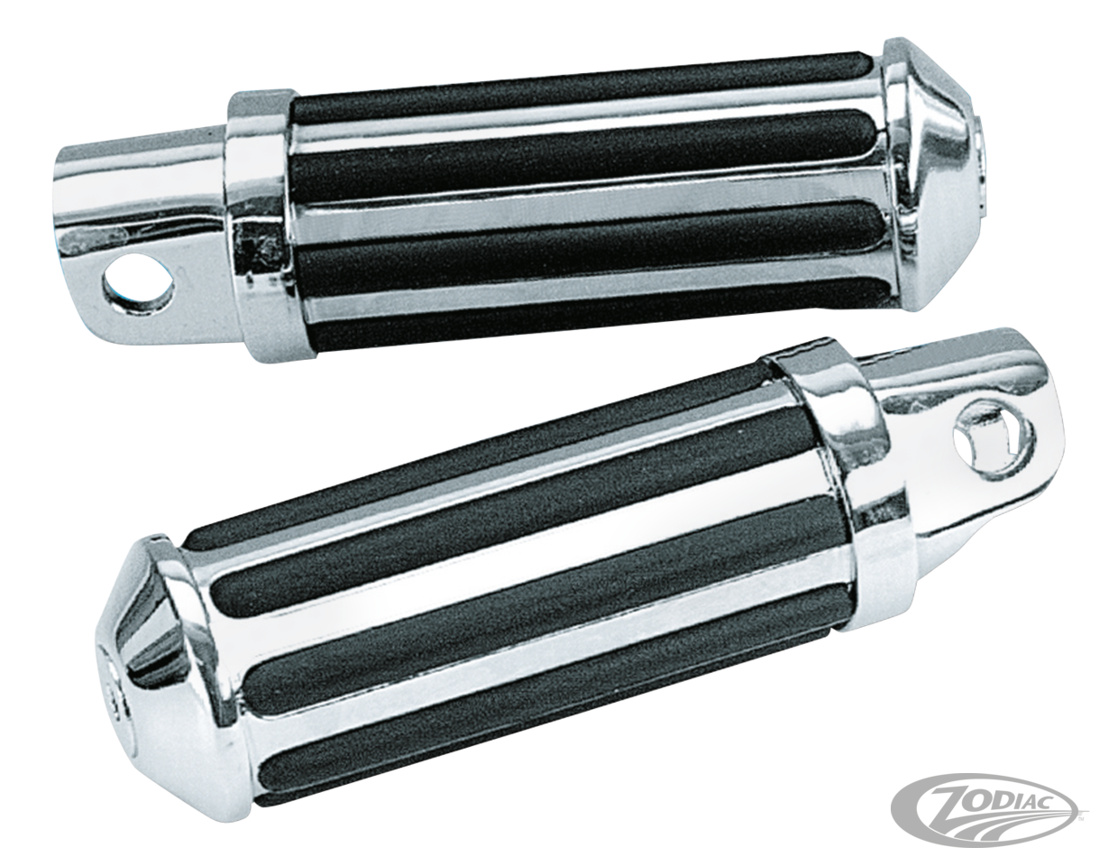 Streamliner-Fußrasten verfügen über ein dickes, einteiliges Gummi im Inneren, um Vibrationen zu absorbieren, und sind mit einer verchromten Hülle überzogen, um Ihrem Bike einen Hauch von Klasse zu verleihen. Diese Genuine Zodiac-Rasten sind stärker als die meisten gleich aussehenden Rasten auf dem Markt. Ein passendes Kickerpedal ist ebenfalls erhältlich.