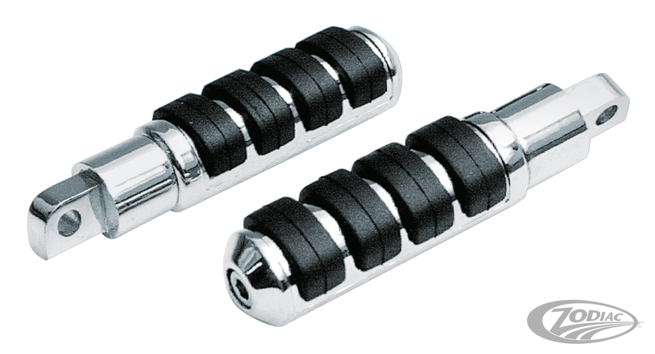Diese hochwertigen Rasten sind entwickelt worden, um Vibrationen zu absorbieren. Dies ist durch die hohlen, haltbaren Gummieinsätze möglich, die mit einem verchromten Bolzen in der Raste befestigt werden. Wenn Sie es leid sind, die O-Ringe an den alten Rasten ständig erneuern zu müssen, dann haben Sie jetzt die Lösung gefunden. Hinweis: Nicht als Kickerpedal zu verwenden!
