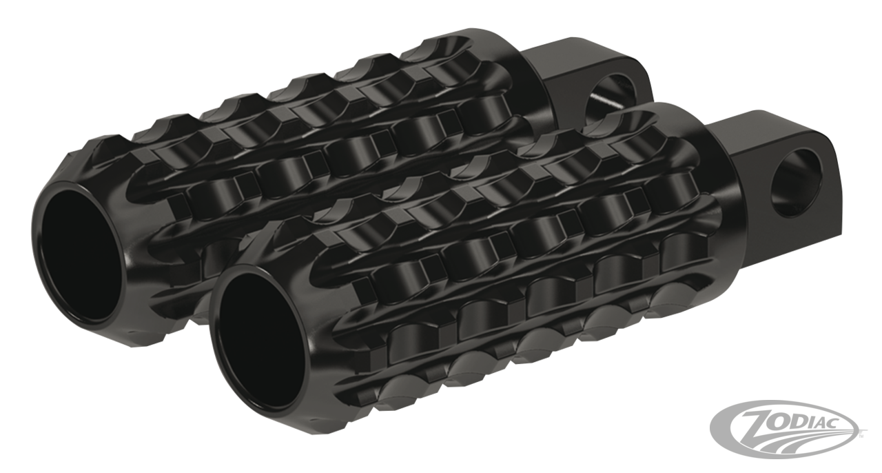 Fussrasten im gerändelten Race-Design aus Billet-Alu. Diese Fussrasten sind etwas kürzer ausgelegt um mehr Schräglage zu ermöglichen. Fussrasten werden paarweise angeboten und eignen sich für die meisten Fahrer- & Beifahreraufnahmen.