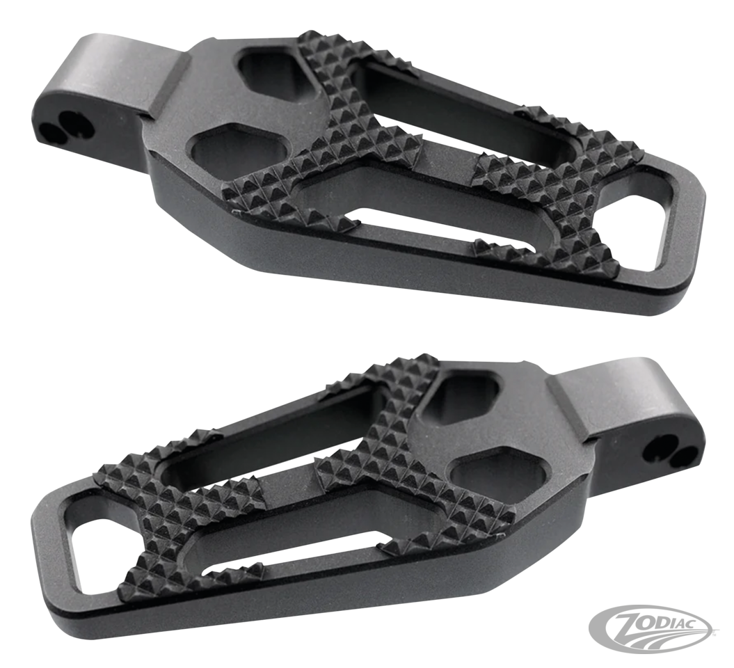 Fußrasten aus Billet-Aluminium mit schwarz eloxiertem Finish werden in Sätzen für links und rechts angeboten. Schalthebel werden einzeln angeboten.
