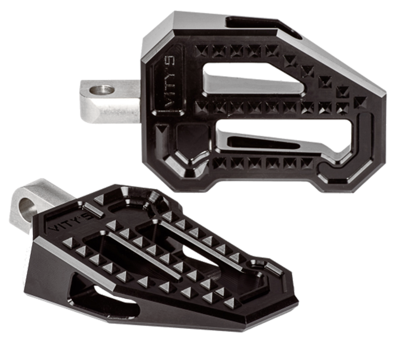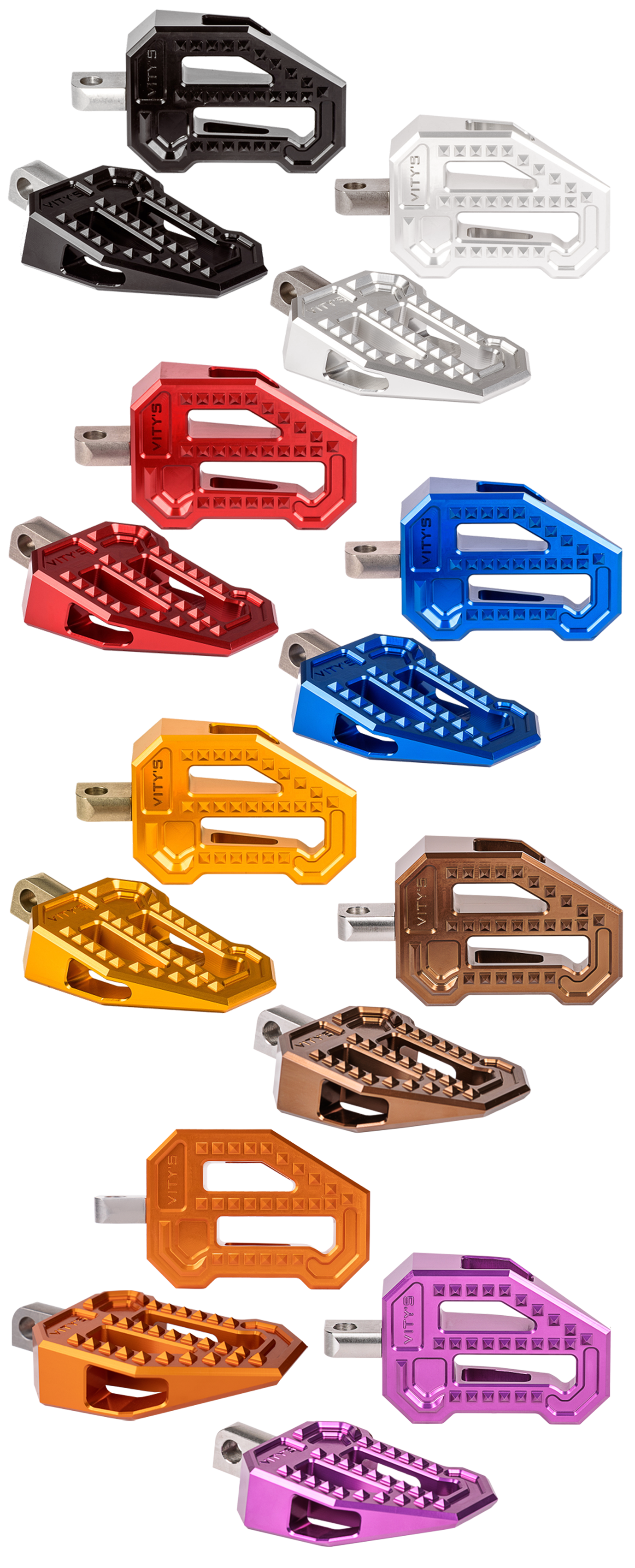 Diese Fußrasten verleihen Ihrem Motorrad einen sportlichen und dynamischen Look. Wie die originalen Vity's Racing Trittbretter verfügen auch diese über das gleiche Rautenmuster für maximalen Grip und Komfort sowie über zahlreiche Farbkombinationen, die perfekt zu Ihrem individuellen Bike passen.
