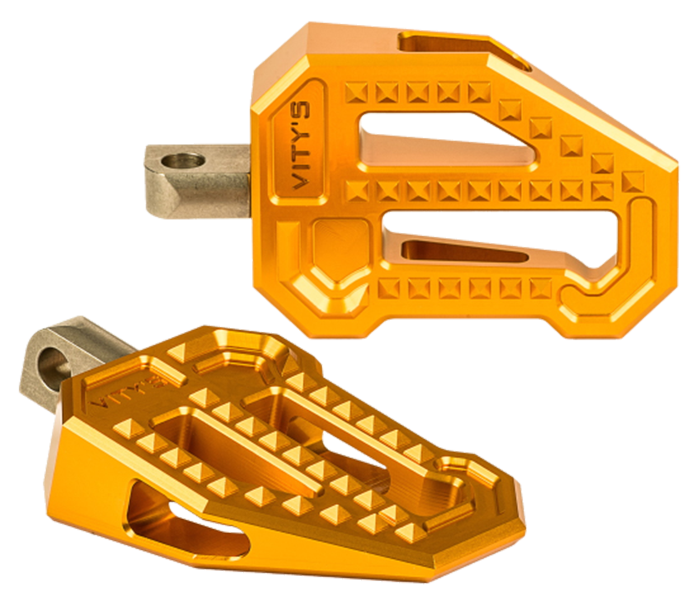 Diese Fußrasten verleihen Ihrem Motorrad einen sportlichen und dynamischen Look. Wie die originalen Vity's Racing Trittbretter verfügen auch diese über das gleiche Rautenmuster für maximalen Grip und Komfort sowie über zahlreiche Farbkombinationen, die perfekt zu Ihrem individuellen Bike passen.