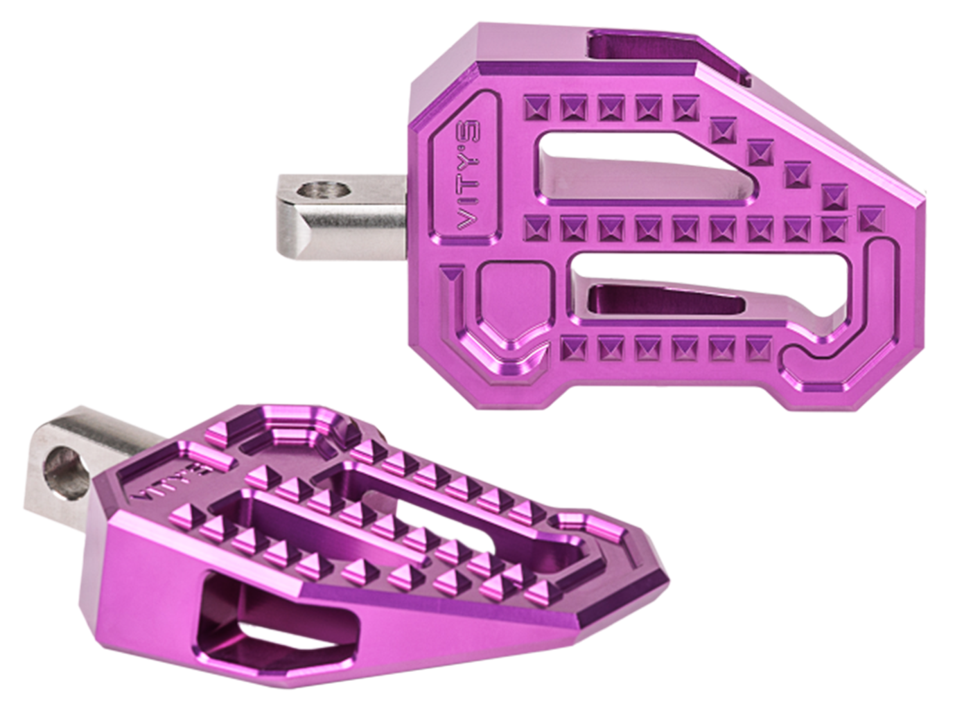 Diese Fußrasten verleihen Ihrem Motorrad einen sportlichen und dynamischen Look. Wie die originalen Vity's Racing Trittbretter verfügen auch diese über das gleiche Rautenmuster für maximalen Grip und Komfort sowie über zahlreiche Farbkombinationen, die perfekt zu Ihrem individuellen Bike passen.