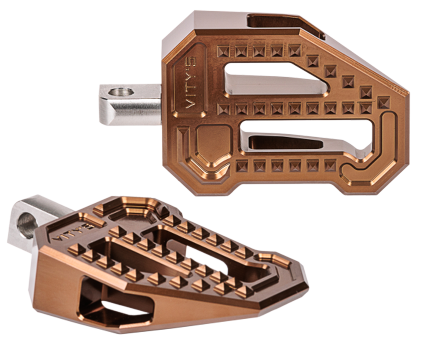 Diese Fußrasten verleihen Ihrem Motorrad einen sportlichen und dynamischen Look. Wie die originalen Vity's Racing Trittbretter verfügen auch diese über das gleiche Rautenmuster für maximalen Grip und Komfort sowie über zahlreiche Farbkombinationen, die perfekt zu Ihrem individuellen Bike passen.