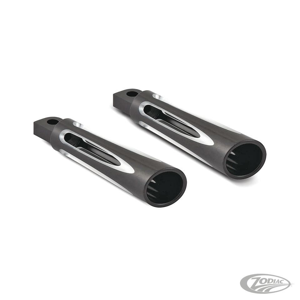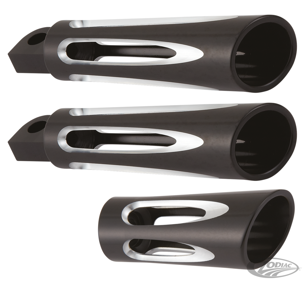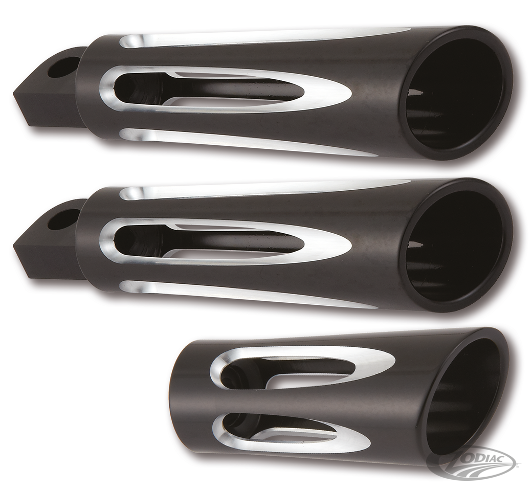 Innovatives Design als Ergänzung für jedes Bike. Griffe im gleichen Design sind erhältlich. Rasten werden aus 6061-T6er Billet-Alu gefertigt. Fussrasten besitzen "männliche" Aufnahmen wie bei den meisten Harley-Davidson Modellen für Fahrer- und Beifahrerrasten verwendet werden.