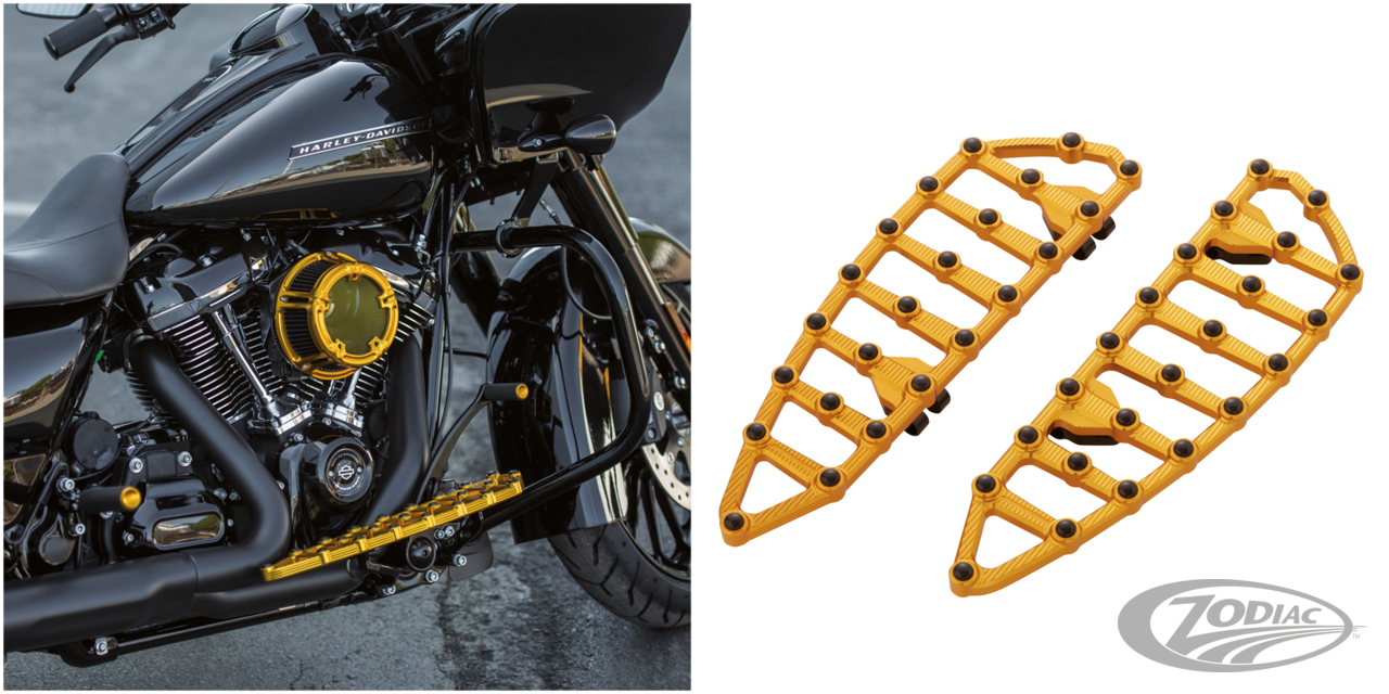 Fahrer Trittbretter für:• Touring ab 1980 (außer FLHTCUL, FLHTKL & FLHTCUL-TC)• Trike ab 2009• Alle FL Softail 1986-2017: Cross Bones, Deluxe, Fatboy, Heritage, Nostalgie, Slim• 2012-2016 FLD Switchback, Gold eloxiertes Finish, Paar