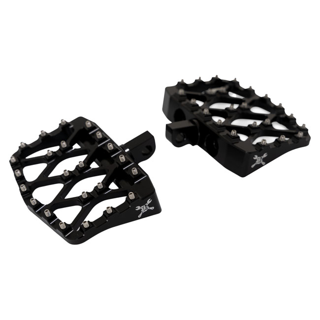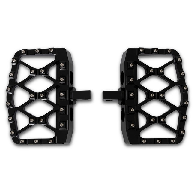 Satin black powder coated lightweight aluminum alloy floorboards. CNC machined; proudly showing the Burly brand laser engraved logo. The serrated surface; with no-slip set screws; offers a bite that makes these boards offer unsurpassed grip for easy-riding in any standard to extreme situation.