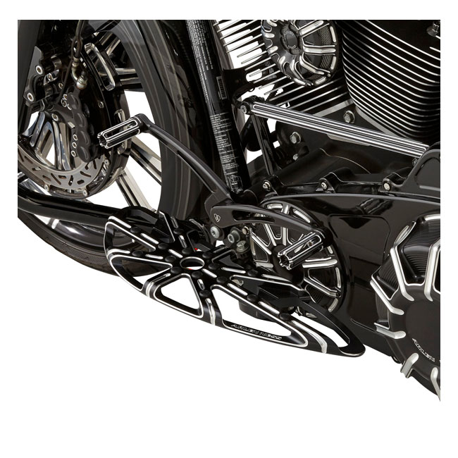 Black anodized Contrast Cut machined finish. CNC machined from forged aluminum to give an artist's impression of floorboard looks with a 10-gauge spread pattern in a 3-D design. Rubber inserts offer anti-slip and board protection. A striking extended length custom styling that is definitely Arlen Ness!