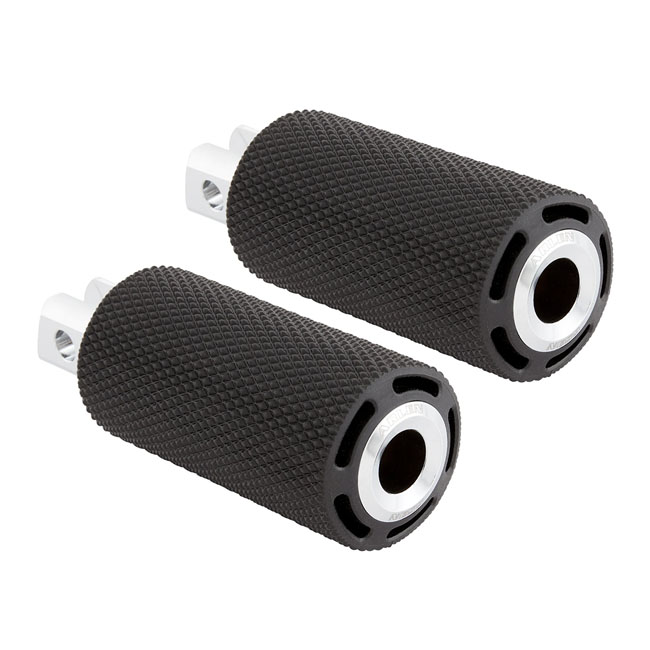 Chrome finish. CNC machined forged billet aluminum with a hollow center; for lightweight with excellent forged strength. Comes with an oversized honeycomb rubber design; the incorporated air chambers drastically reduce vibration. Foot grip is ensured through a knurled diamond outer pattern. The short overall length will increase ground clearance while cornering. With laser engraved Arlen Ness logo."