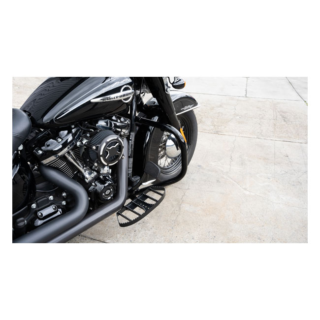 Satin black powder coated steel floorboards; TIG welded for strength. The serrated surface offers a bite that makes these boards offer unsurpassed grip for easy-riding in standard to extreme situations.