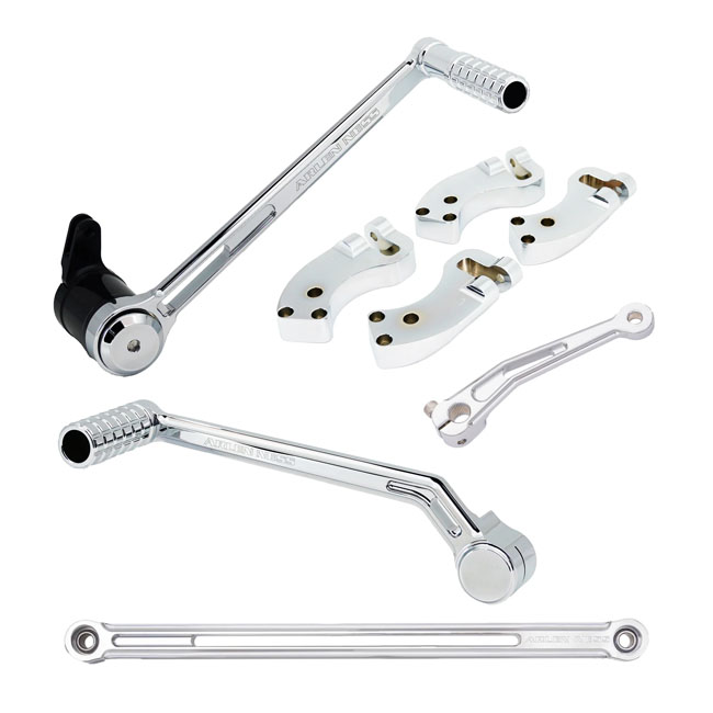 CNC machined billet aluminum. Moves the floorboard and foot control position 3" (7.6cm) further forward for taller riders. Kit includes: Solo shift arm; brake arm; inner shift lever; shift rod and floorboard brackets. - Shifter includes a matching billet spacer - Shift rod comes with hydraulically pressed spherical bearings; no need for regular heim joints for an ultra clean look. Note: Floorboard brackets are designed specifically for Arlen Ness® floorboards.