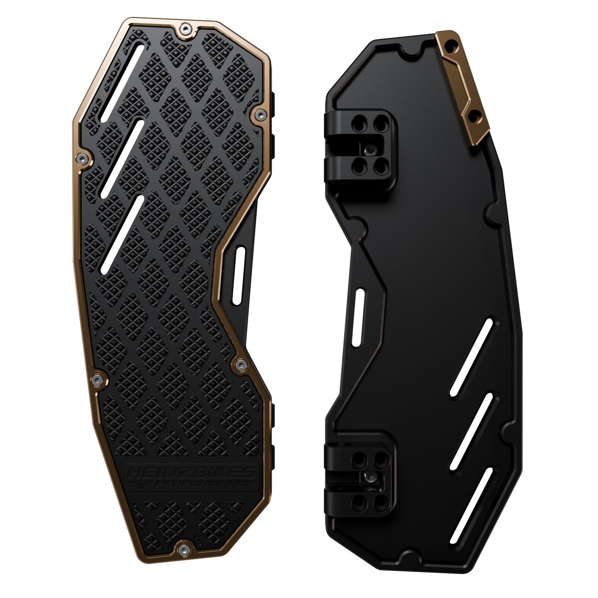 - Mit unserem einzigartigen Design und höchster Qualität aus hochwertigem Billet-Aluminium, CNC-gefräst, sind unsere neuen HeinzBikes® PERFORMANCE Floorboards robuster und leichter als andere Trittbretter am Markt..