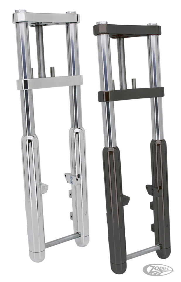Die Jungs von Zodiac haben einen Trend zu schmalen Gabeln fest gestellt und erkannt, dass schmale Gabeln auch cool sein können. Daher wird die bekannte Fat Bubba mit 41mm Standrohren jetzt auch mit einer schmalen Gabelbrücke als Slim Bubba Version angeboten. Mit einem Stichmass von 195mm passen in diese Gabeln so gerade die Narrow Glide Radnaben mit einer originalen oder vergleichbaren Bremszange hinein. Die Gabelbrücken und Tauchrohre sind aus hochglanzpoliertem Billet-Alu oder schwarz-eloxiertem Finish und wirken durch die abgerundeten Achskappen und Staubkappen sehr klassisch und bieten modernen Fahrkomfort. Die obere Gabelbrücke ist 1 1/8" (29mm) dick und die untere sogar 1 5/16" (34mm). Die Tauchrohre sind ganze 2 3/8" (60,3mm) im Durchmesser und besitzen Aufnahmen zur Montage von Bremszangenhaltern auf der linken und der rechten Seite sowie für die Schutzblechmontage. Separat erhältlich sind zudem Halter zur Montage von Bremszangen der Modelle 1984-1999 und Modelle ab 2000. Aus optischen Gründen besitzt diese Gabel verdeckte Aufnahmen für die 19mm Radachse und abgerundete Staubkappenabdeckungen. Erhältlich sind verschiedene Gabellängen und Gabelbrücken mit 0°, 3° und 6° Rake mit 3 verschiedenen Lenkanschlägen für nahezu jeden originalen oder Zubehörrahmen. Im Lieferumfang sind zudem eine Flasche Gabelöl Typ E enthalten. Hinweis: Die Gabellänge wird von der Achsmitte bis zur Unterseite der oberen Gabelbrücke ermittelt wobei das Standard FXWG Mass gleich der FL Länge +4" entspricht. Gabelölvolumen =300cc pro Standrohr. Viskosität 20W20 Type E Light für den Strassengebrauch oder SAE 40 Extra Heavy-Duty für den Renneinsatz.