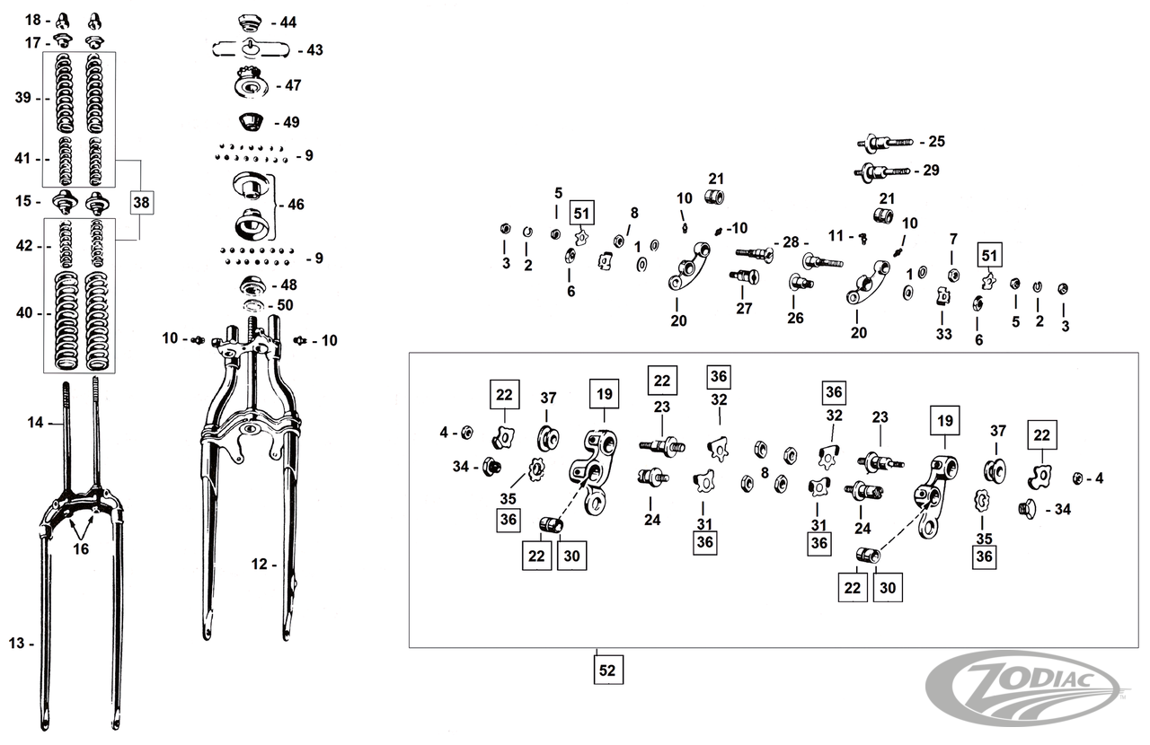 Einzelteile für Springergabeln der meisten Solo 45CI 1930-1952, Servi-Car 1941-1957 sowie Big Twin 1941-1948 wir angegeben. Artikel werden, sofern nicht anderweitig angegeben, einzeln angeboten.