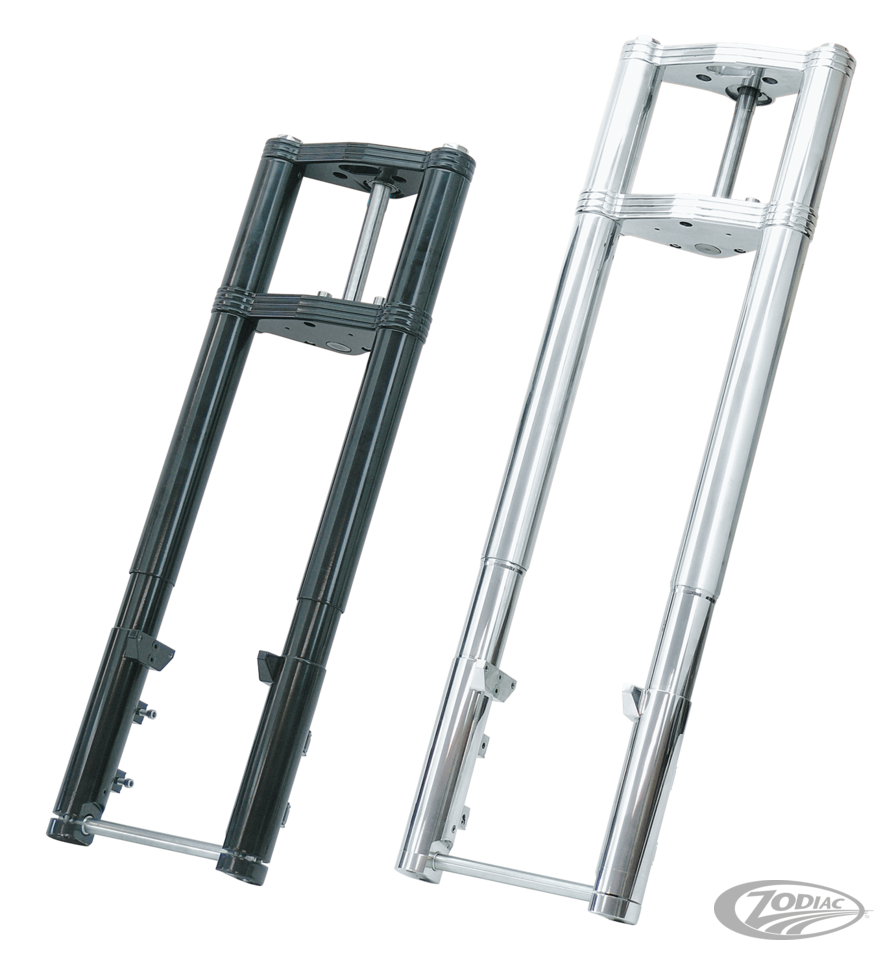 Diese Billet-Alu Vorderradgabeln sind "Made in Europe" und wirklich etwas besonderes. Sie zeichnen sich durch massive Gabelbrückenklemmungen aus, fette Tauchrohre und Abdeckungen, voll verkleidete Standrohre sowie versteckte Achsaufnahmen. Dieses Zodiac Exklusivprodukt ist unschlagbar im Preis und in der Qualität. Egal ob Sie diese Gabel als Originalersatz verwenden oder für ein Custom Projekt, sie verleiht die von den Customizern bevorzugte fette Optik. Die Gabelbrücken, die Gabelholmabdeckungen sowie die Gabelholme sind aus Billet-Aluminium gefertigt und sind wahlweise in perfekt hochglanzpoliertem Finish oder in schwarz lieferbar. Die obere Gabelbrücke ist 1 1/8" (29mm) stark, die untere Gabelbrücke misst ganze 1 5/16" (34mm). Die Gabelholme und deren Abdeckungen besitzen einen Durchmesser von sehr beeindruckenden 2 3/8" (60mm). Beide Tauchrohre besitzen Befestigungspunkte für die Schutzblechmontage sowie für Bremsenhalter. Adapterplatten für Evo-Bremszangen der Modelle von 1984-1999 sind erhältlich, werden aber separat angeboten. Adapterplatten für andere Bremszangen müssen angefertigt werden. Erhältlich ist +3", +4", +6", +8", +12", +14" sowie +16" Überlänge gegenüber der Standard FL Gabel mit einem Rake von 0°, +3° oder +6° in der Gabelbrücke. Diese Gabel wird komplett mit 1 Liter Gabelöl Typ E und 3 verschiedenen Lenkanschlägen geliefert, die sich für die gängigsten Rahmen eignen. Für den Einbau an Dyna Modellen von 2006-2017 muss ein Lenkjoch- und Abstandshalter-Kit, ZPN 600129 für polierte Gabeln oder ZPN 600130 für schwarze Gabeln, separat erworben werden. Hinweis: Die angegebenen Längenangaben beziehen sich auf das Mass von der Unterseite der oberen Gabelbrücke bis zur Mitte der Radachse. Eine Fat Bubba mit +4 inch besitzt die gleiche Länge wie eine serienmässige FXWG Gabel. Gabelöl-Wechsel: Pro Holm 300cc 20W20 Spectro Typ E dünnes Gabelöl für den normalen Strassenbetrieb oder 300cc SAE 40 Extra Heavy-Duty Öl für den Renneinsatz.