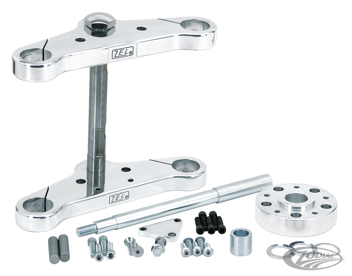 Diese polierten 230mm breiten Gabelbrücken aus Billet-Alu besitzen die gleichen Eigenschaften wie Rev"O"lution Gabelbrückenserie (aus besonders stabilem 25mm dickem Aluminium). Erhältlich mit 0°, 3° oder 6° Reckung. Bei den gereckten Versionen können 10-25cm längere Standrohre montiert werden, um die Rahmenunterzüge wieder parallel zum Boden verlaufen zu lassen. Die Sätze beinhaltet alle Anbauteile inklusive eines Halters zur Scheinwerfermontage. Das Kit für FX 1977-1986 mit 35mm Standrohren wird mit 2 Bremsscheiben-Distanzen geliefert. Dieses Kit kann auch für Sportster mit 35mm Standrohren verwendet werden wenn der Lenkanschlag modifiziert wird und das Lenkjoch ausdistanziert wurde. Für alle anderen Modelle mit 2 Bremsscheiben muss eine zweite Distanz für die Bremsscheibe separat bestellt werden. Hinweis: Sollte der originale Fender weiter verwendet werden, müssen zusätzliche Distanzen zum Ausgleich der Breite verwendet werden.