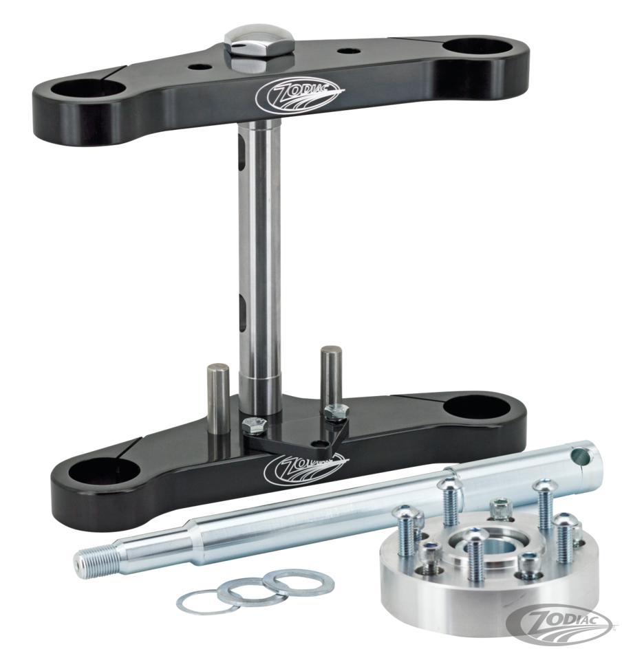 Diese polierten 230mm breiten Gabelbrücken aus Billet-Alu besitzen die gleichen Eigenschaften wie Rev"O"lution Gabelbrückenserie (aus besonders stabilem 25mm dickem Aluminium). Erhältlich mit 0°, 3° oder 6° Reckung. Bei den gereckten Versionen können 10-25cm längere Standrohre montiert werden, um die Rahmenunterzüge wieder parallel zum Boden verlaufen zu lassen. Die Sätze beinhaltet alle Anbauteile inklusive eines Halters zur Scheinwerfermontage. Das Kit für FX 1977-1986 mit 35mm Standrohren wird mit 2 Bremsscheiben-Distanzen geliefert. Dieses Kit kann auch für Sportster mit 35mm Standrohren verwendet werden wenn der Lenkanschlag modifiziert wird und das Lenkjoch ausdistanziert wurde. Für alle anderen Modelle mit 2 Bremsscheiben muss eine zweite Distanz für die Bremsscheibe separat bestellt werden. Hinweis: Sollte der originale Fender weiter verwendet werden, müssen zusätzliche Distanzen zum Ausgleich der Breite verwendet werden.
