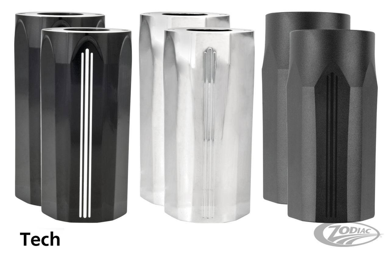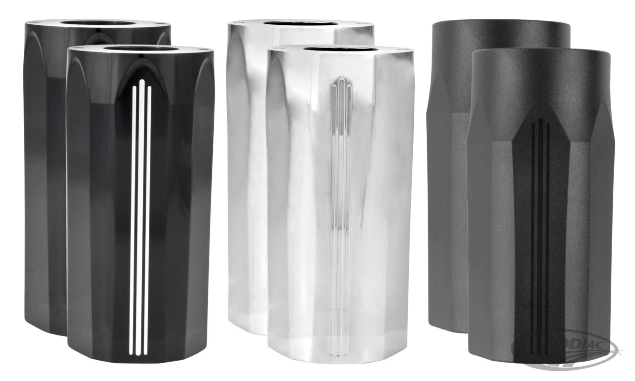PM Standrohrcover werden aus Billet-Alu gefertigt; in verchromt, Contrast-Cut oder 2-Ton Struktur Black Ops. Eignen sich für Verwendung mit OEM Tauchrohren, aber kommen am besten Geltung mit PM Tauchrohren im gleichen Finish.