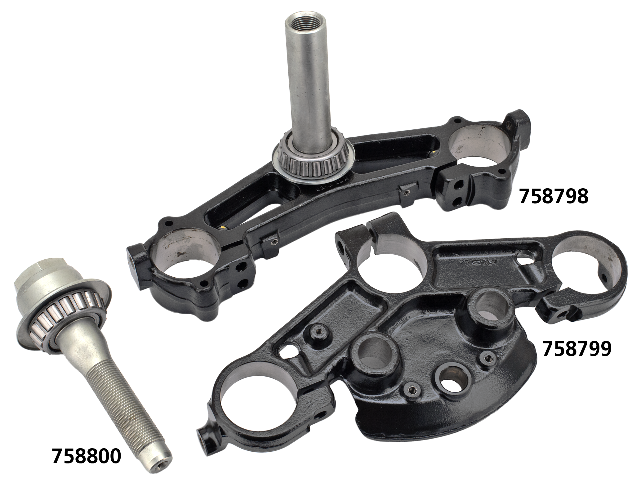 Replika der unteren Gabelbrücke mit Gabelschaft, Lager und Staubschutz, oberer Gabelbrücke. Zusammen ergeben sie ein komplettes Gabelbrücken Set, die Teile sind jedoch auch einzeln erhältlich. Für alle Touring ab 2014 mit 49mm Vorderradgabel.