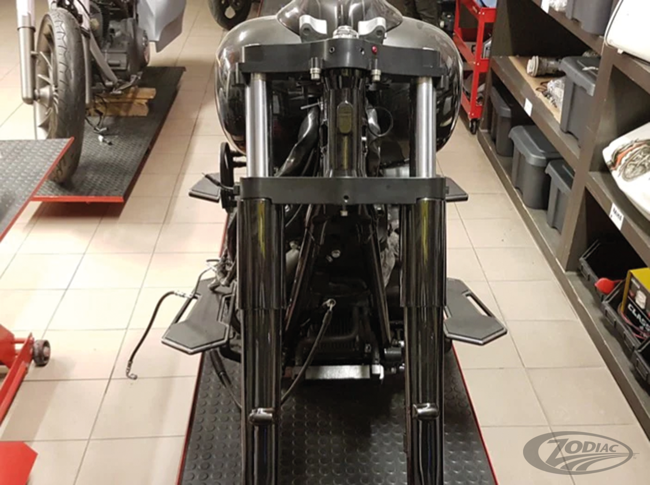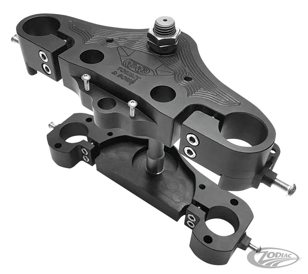 Diese Gabelbrücken-Umbausätze aus Billet-Aluminium sind die optimale Komplettlösung, wenn Sie auf ein 23-Zoll-Vorderrad umsteigen. Die 6 Grad Reckung garantiert einen korrekten Nachlaufwert und somit optimale Spurstabilität und Handling.
