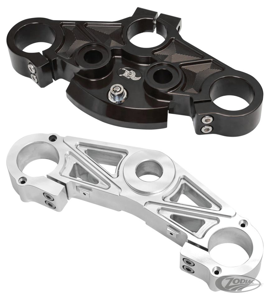 Bitte nehmen Sie sich die Zeit, auf die Designdetails dieser präzisionsgefertigten oberen und unteren Gabelbrücken zu achten. Die untere Brücke muss mit dem OEM-Lenkschaft montiert werden. Zum Entfernen und Einbauen benötigen Sie eine hydraulische Presse. Obere und untere Brücken werden einzeln angeboten, sodass Sie sich für ganz Schwarz oder ganz Poliert oder eine beliebige Kombination entscheiden können.